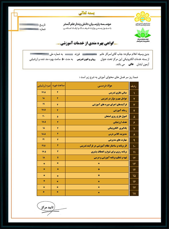 - برای بسیاری از دانشپذیران گرامی ، دریافت یک گواهینامه پایان دوره کافی نیست و بسیاری از ایشان علاقمند هستند که ریز دروس سپری کرده در دوره ی آموزشی خود را نیز دریافت کنند.